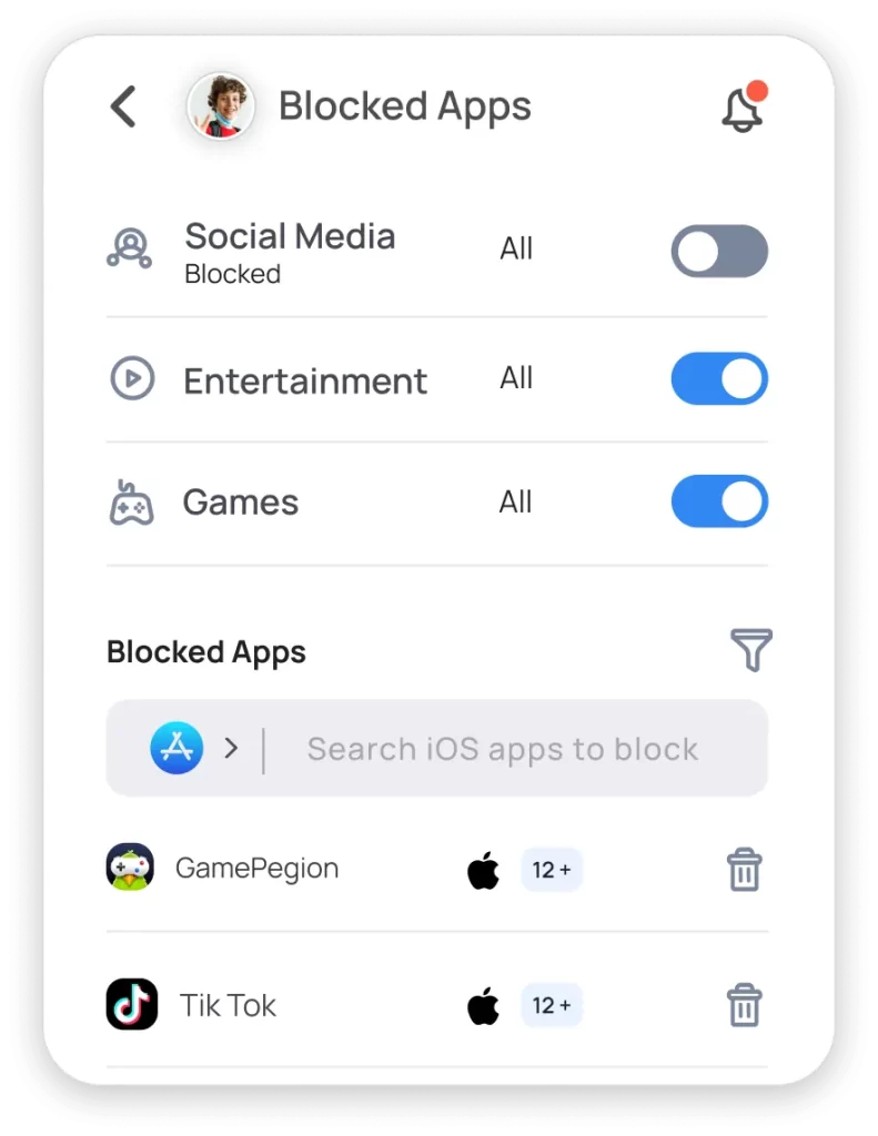 - App Management: You can block or allow specific apps on your child’s device. If you’re concerned about GamePigeon or any other app, you can easily manage access and set time limits for various apps. Mobicip blocks all apps rated 17+ by default for kids, reducing the likelihood of them stumbling across inappropriate content. While most app blockers only allow you to block installed apps, Mobicip goes one step further by enabling you to block apps in advance, even before your kids download them!