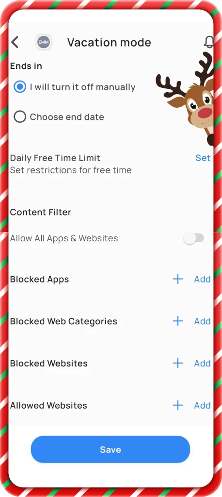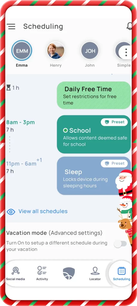 - Configure screen time schedules e.g., “Holiday Break Mode.”
