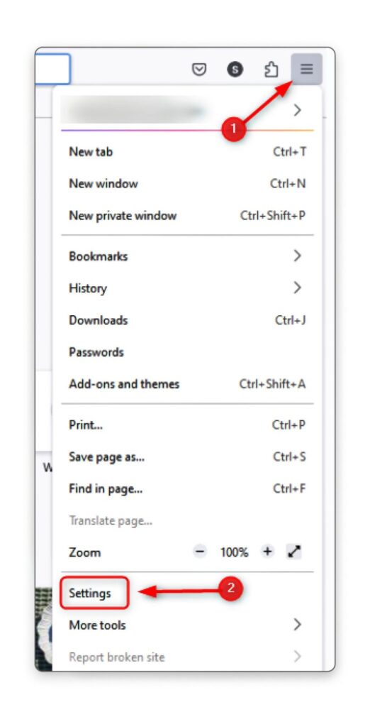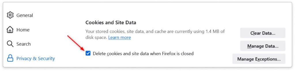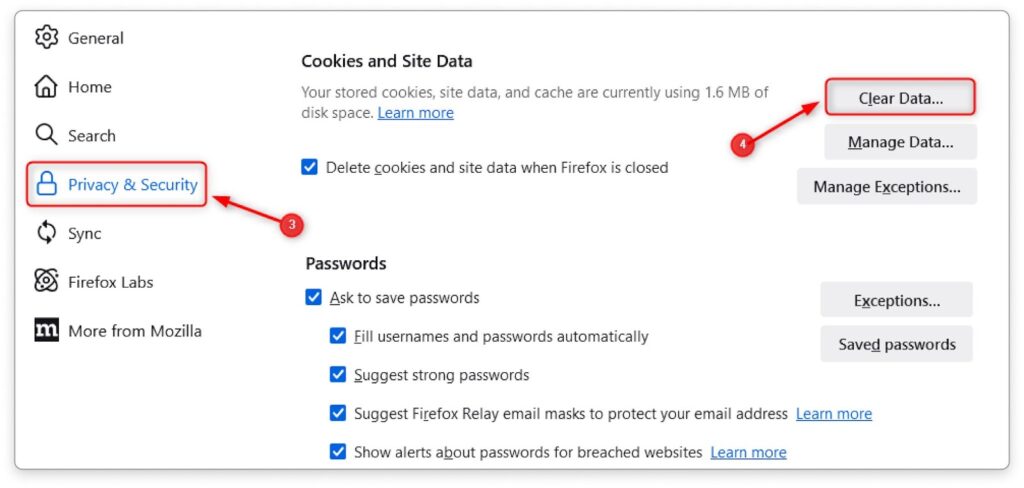 In Mozilla Firefox > Open browser > Select hamburger menu on the top right corner, choose Settings > Select Privacy & Security > Scroll down and Click the Clear Data button.