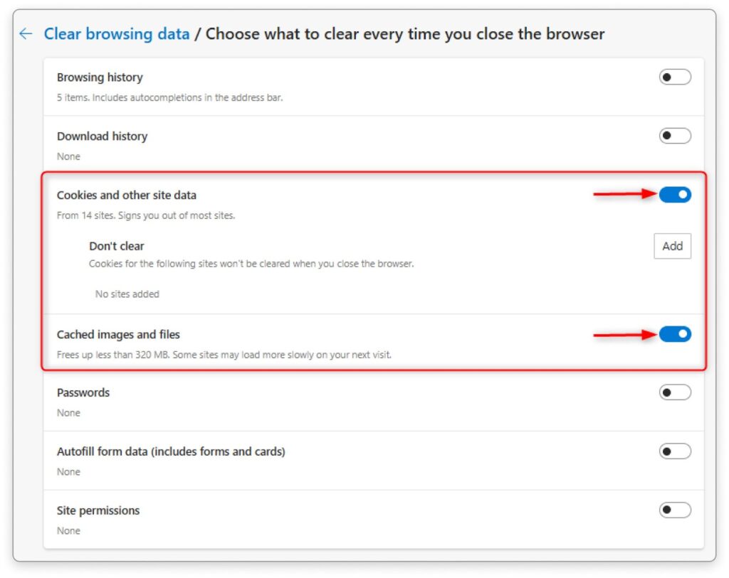 In Edge browser > Click on the three horizontal dots in the upper right corner of the browser > Scroll down to Settings > Click on Privacy, Search, and Services > Click on Choose what to clear every time you close the browser > Toggle the Cookies and Cache options.