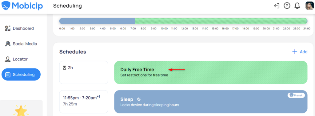- Set customizable limits: You can make use of Mobicip’s daily free time limit and scheduling features to limit the total screen time for your child.